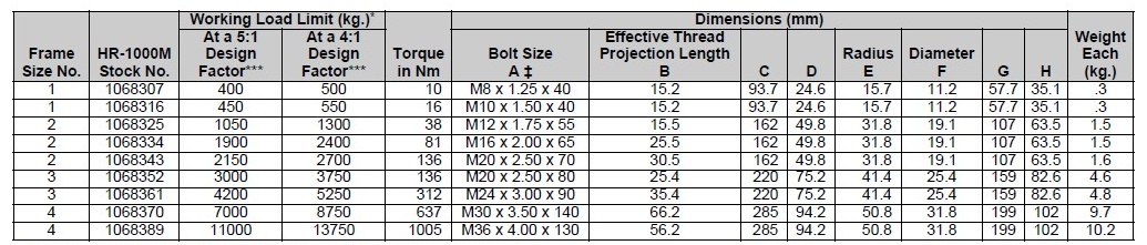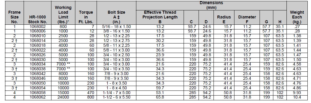 ** Sarcina maxima este de 4,5 ori mai mare decat Sarcina Limita de Lucru (W.L.L.) pentru inelul de ridicare cu 7000 lbs. (filet UNC) testat la unghi de 90 grade.
