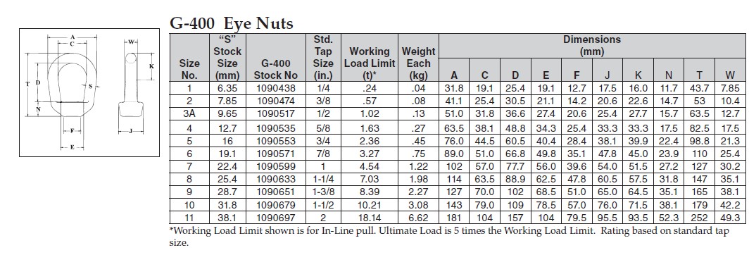*Sarcina Limita de Lucru este data pentru tragere in linie dreapta.Sarcina maxima este de 5 ori mai mare decat Sarcina Limita de Lucru (W.L.L.) Evaluarea in functie de dimensiunea filetului standard. |