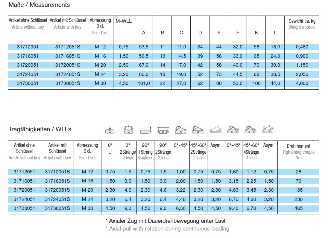 - The device is suitable for rotation during loading only with axial pull; the eyebolt can be used in every other pull direction